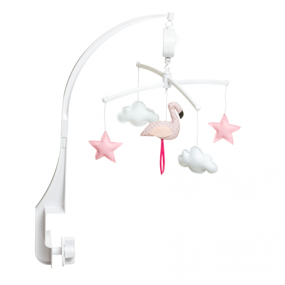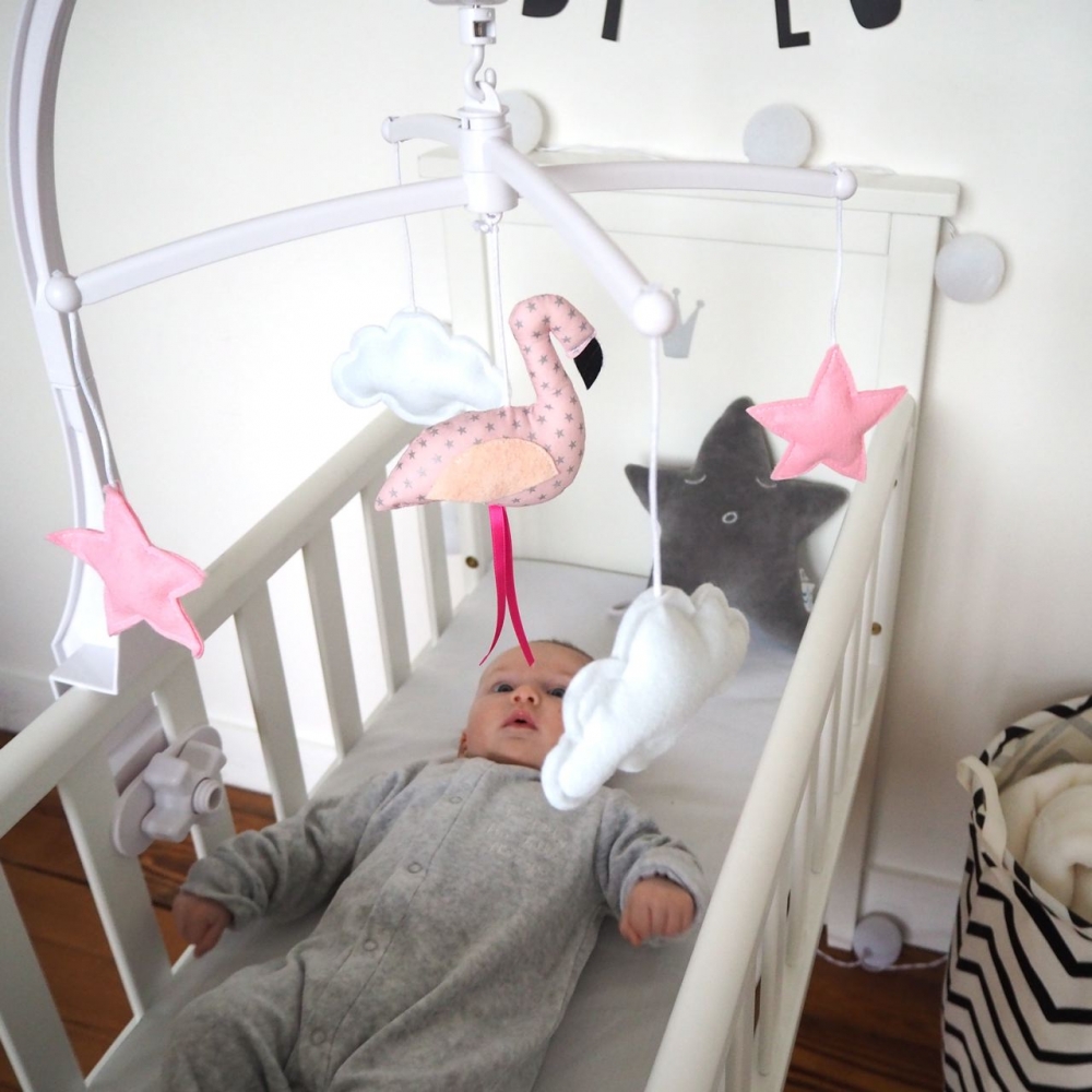 Mobile musical “flamant rose” de chez Pouce et Lina pour accrocher au lit de bébé qui pourra ainsi s’endormir bercé par une douce mélodie.