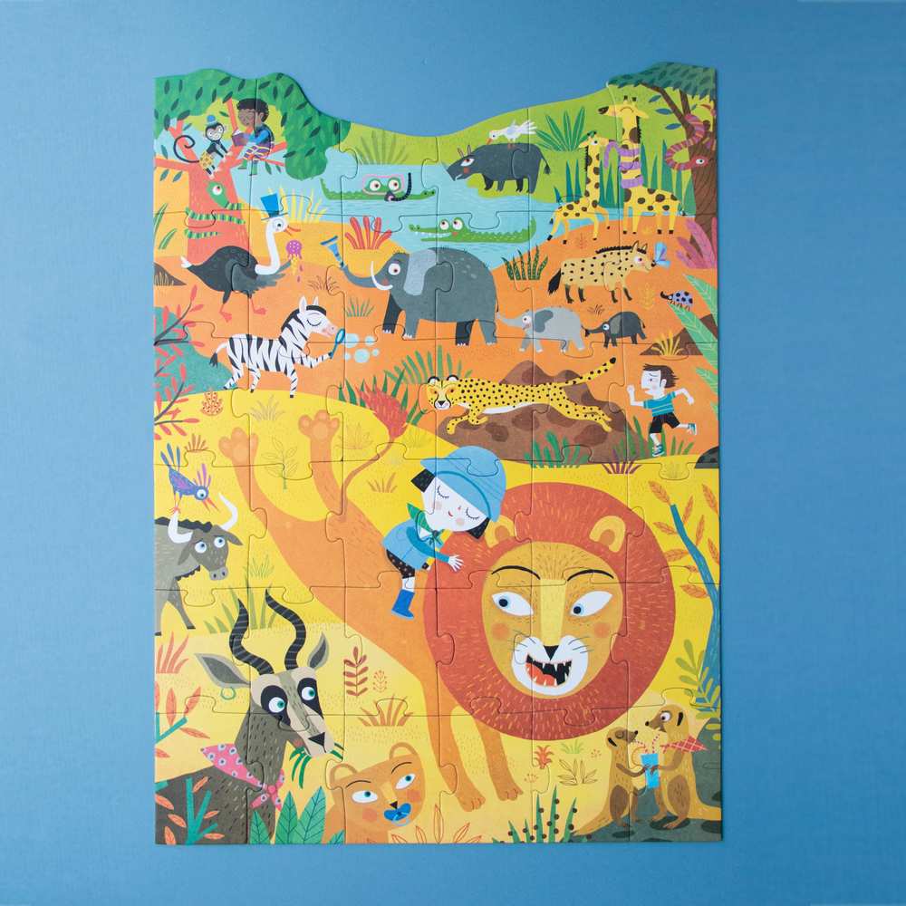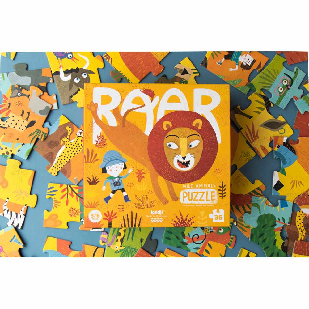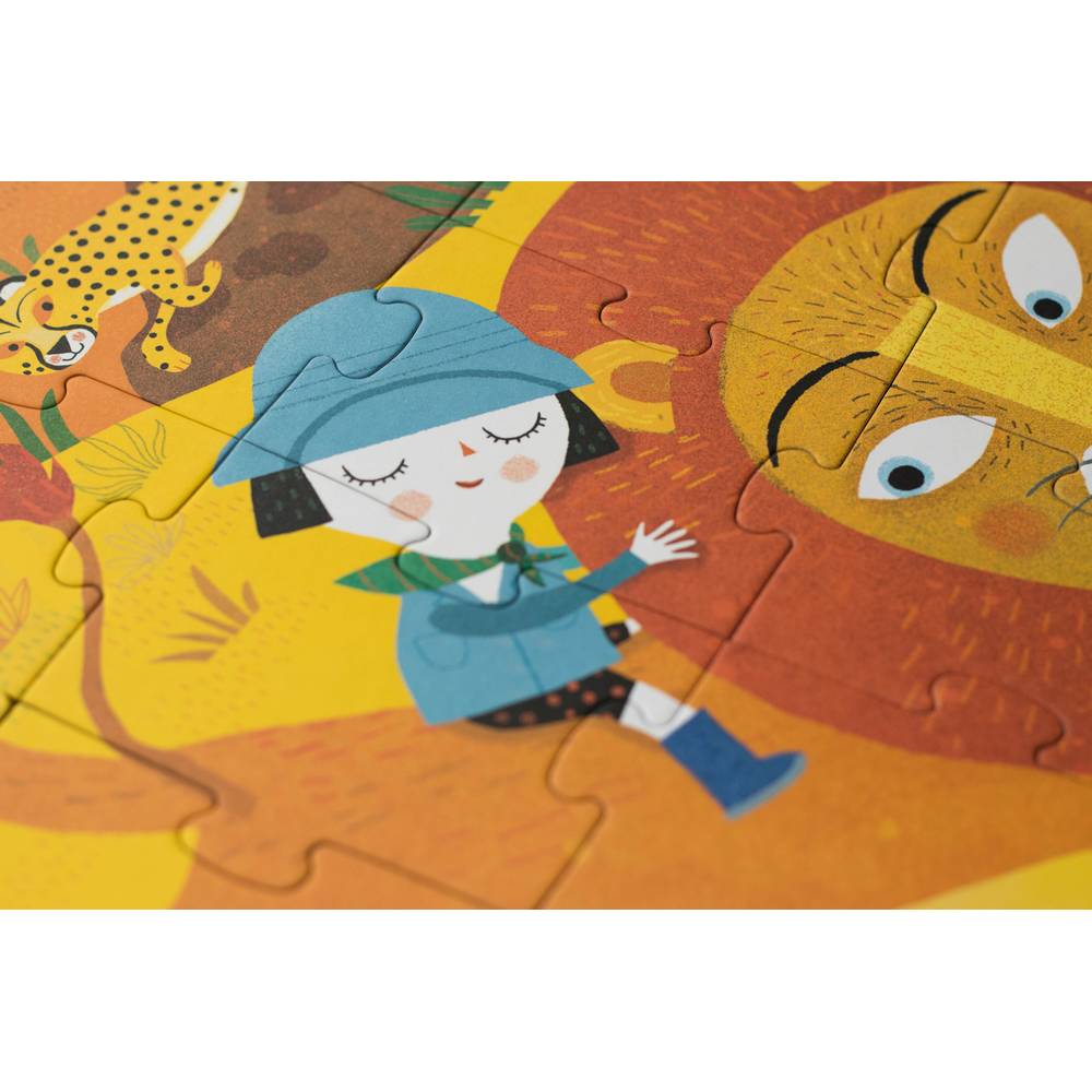 Ce puzzle “roar” de chez Londji contient 36 pièces et représente des explorateurs parmi des animaux sauvages dans un décor de savane très coloré.