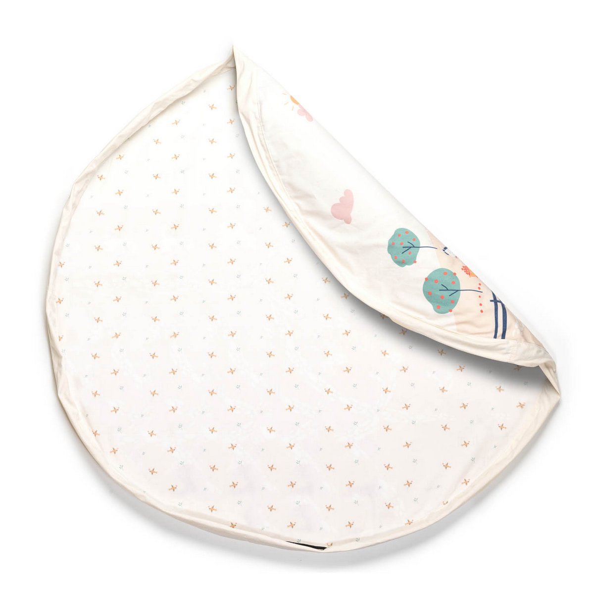 Sac à jouets en tissu motif “ferme” de chez Play and Go qui se transforme en tapis de jeu ou en sac grâce à ses liens coulissants.