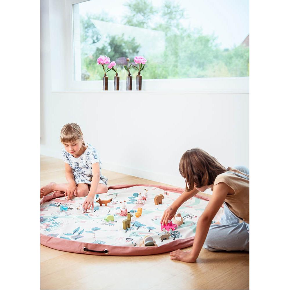 Sac à jouets en tissu motif “walk in a park” de chez Play and Go qui se transforme en tapis de jeu ou en sac grâce à ses liens coulissants.